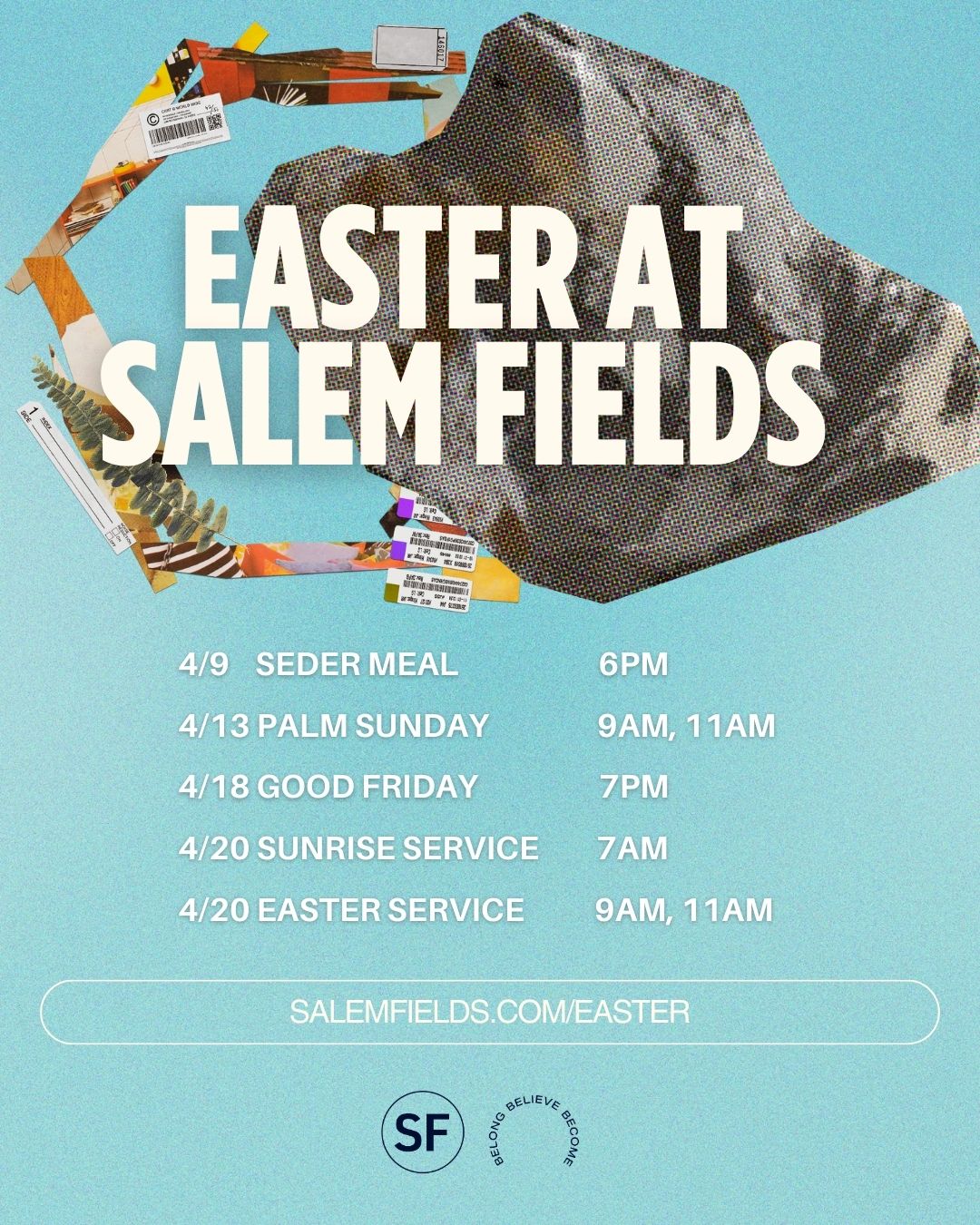 We couldn't be more excited to celebrate the Easter season with you at Salem Fields. Holy Week is such a special time in the life of the Church as we reflect on Jesus's death on the cross and celebrate His resurrection. We would love for you to join us as we worship together, ponder, pray, and reflect on His sacrifice, and celebrate His victory over the grave. Below are our worship opportunities and details. Should you have any further questions, we'd love to hear from you at info@salemfields.com.
