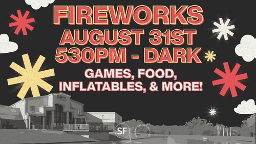 Our Annual Community Fireworks Celebration will take place on Sunday August 31st at 5:30PM and will finish with a professional fireworks display at dark. There will be food trucks, games and activities for everyone. Grab your friends and plan to be a part of this