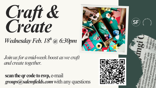 Come join us on Wednesday, February 18th for a mid-week boost as we craft and create together. All materials provided. There will be a small fee to cover costs. RSVP HERE!