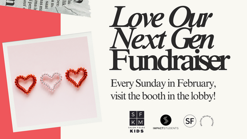 - Love Our Next Gen Fundraiser- We’re raising funds this February to support our Next Gen ministries— kids and students— attending life-changing events that deepen their faith, strengthen their relationships with God and others, and equip them to live out their calling in Christ. These events provide opportunities for powerful worship, inspiring speakers, service projects, and spiritual growth that leave a lasting impact. Visit our booth in the lobby during Take-5 or between services to make a donation and/or write an encouraging card or prayer for our kids and students. Let’s invest in the spiritual journeys of the next generation together!