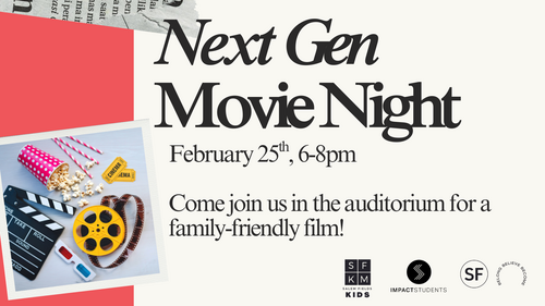 February 25th, 6pm-8pm - Grab your family and join us in the auditorium for a fun night of movies, popcorn, and community! We’ll be watching a family-friendly film together, and concessions will be available with all proceeds going directly to the Next Gen Events Scholarship Fund. Come enjoy a night out and support our kids students at the same time!