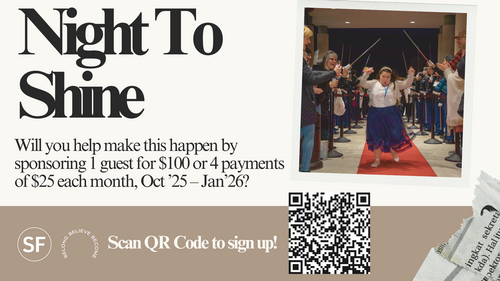 Night To Shine Sponsorship : Night to Shine is an evening honoring guests with special needs from our community! They engage in a full prom experience from dinner, corsages/boutonnieres, limo rides & red carpet entrance to dancing/karaoke and each one being crowned King or Queen. It’s a night to celebrate them as God’s children and shower them with His love. Will you help make this happen by sponsoring 1 guest for $100 or 4 payments of $25 each month, Oct ’25 – Jan’26???